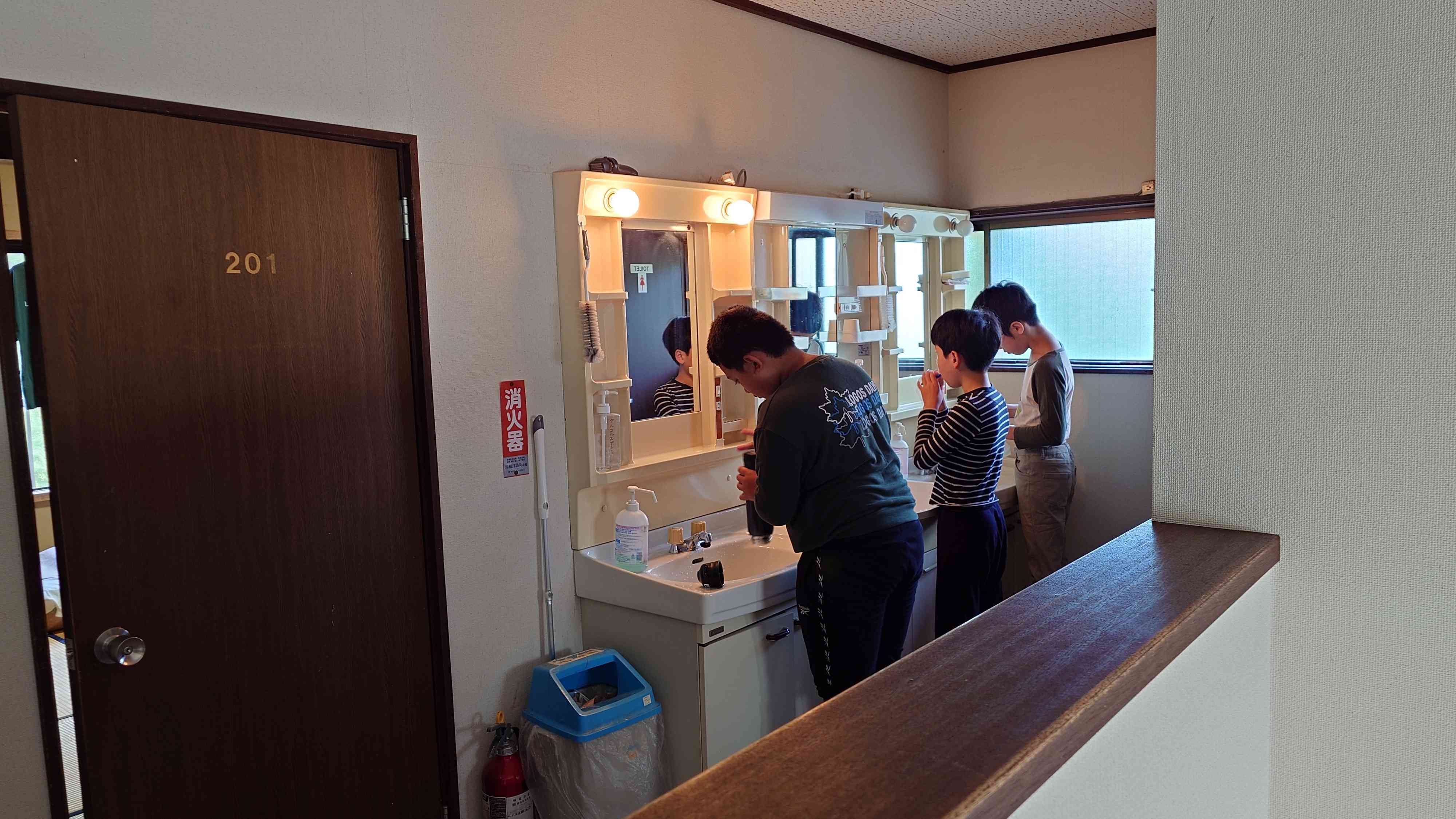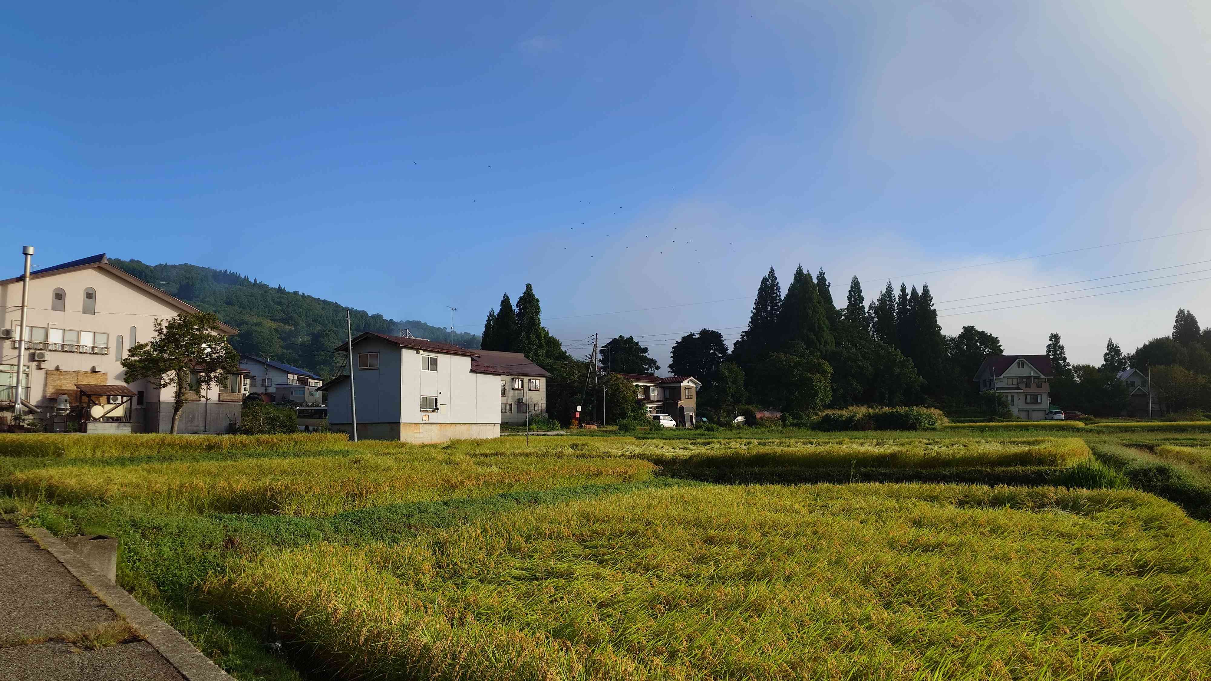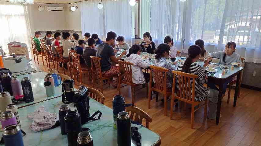 2日めが始まりました。 早朝かかっていた霧も晴れ、良い天候で稲刈りができそうです。 各宿、朝の仕度を整え朝食を食べました。 もうすぐ、全体集合して稲刈りの場所へ向かいます。